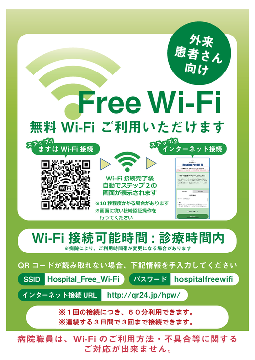 患者様サービスの向上を目的として、ご要望が多数寄せられていた『Wi-Fi接続サービス』を導入いたしました。こちらのサービスは「外来患者さん用(無料)」と「入院患者さん用(有料)」があり、利用可能時間や利用料金などに違いがありますので以下をご確認ください。
